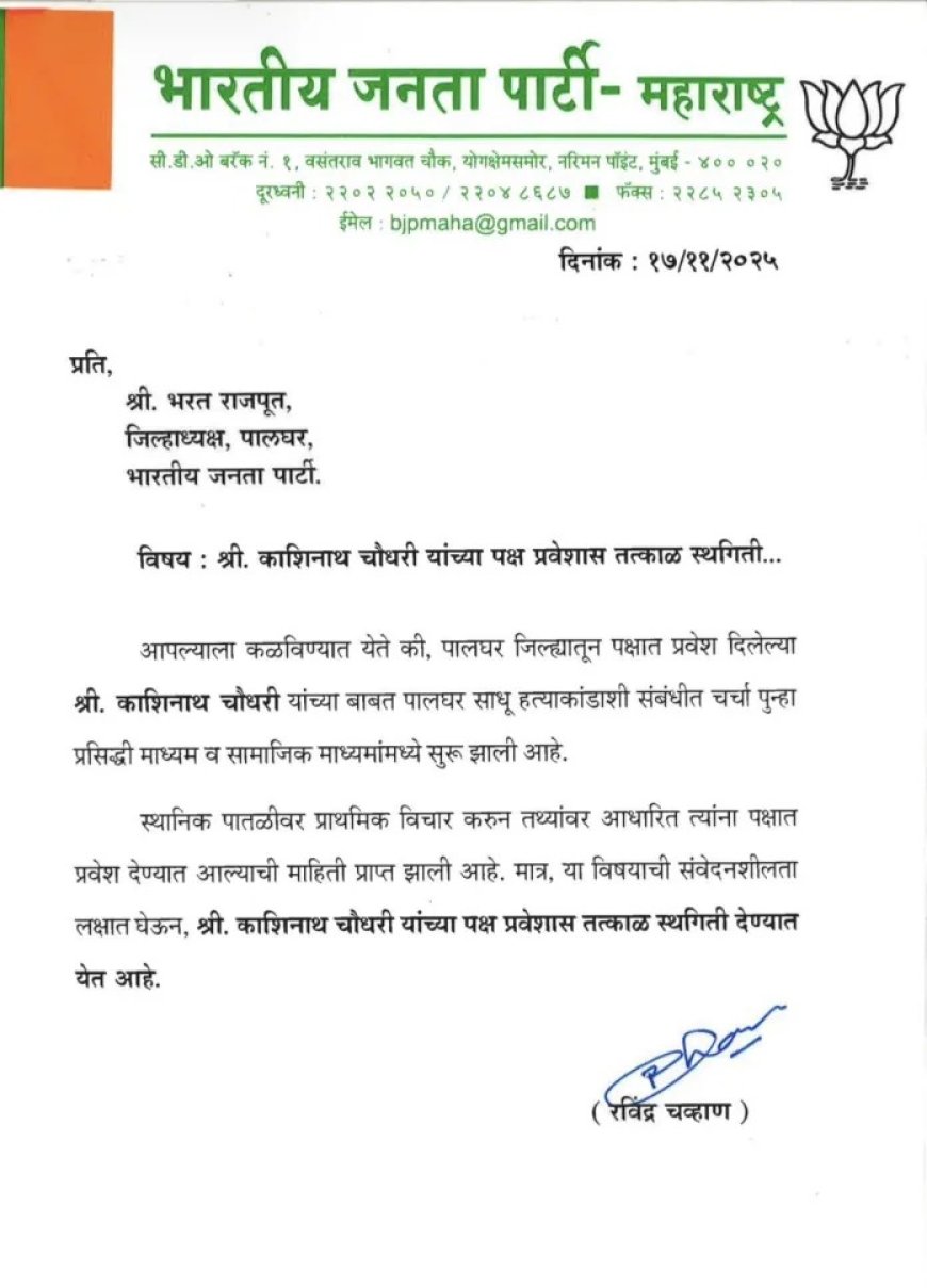 16 एप्रिल 2022 रोजी पालघरमध्ये दोन साधूंची जमावाने हल्ला करून जिवंत ठार केले, ही संतापजनक घटना लॉकडाऊनमध्ये उध्दव ठाकरे सरकारच्या काळात घडली होती. तेव्हा भाजपाने ठाकरे व महाविकास आघाडीला लक्ष्य केले. एकनाथ शिंदेनी या घटनेचे निमित्त करून शिवसेनेत बंड केले. या घटनेतील एक मुख्य आरोपी काशीनाथ चौधरी यांना 3 हजार समर्थकांसह भाजपात प्रवेश दिला. विशेष म्हणजे चौधरी यांनी यावेेळी जोरदार शक्तीप्रदर्शन केले. निवडून येण्यासाठी काय पण! या थराला जाण्याची भाजपाची आजची इन्स्टंट थेअरी किती धोकादायक आणि गंभीर वळणावर गेली आहे. त्यामुळे *"कुठे नेऊन ठेवला भाजपा"* असा प्रश्न उपस्थित होतो.