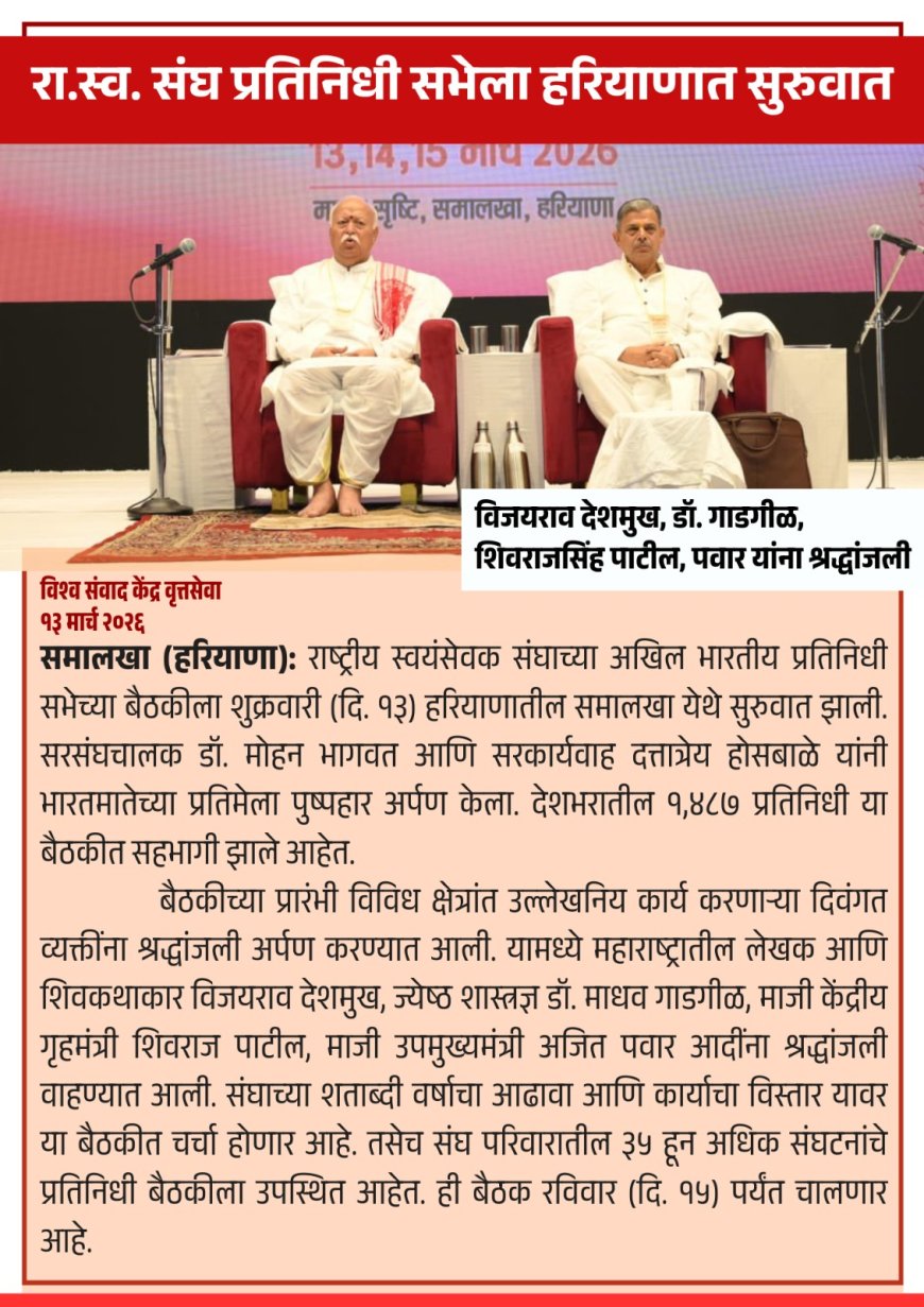 रा.स्व.संघाची अ.भा.प्रतिनिधी सभा बैठक हरयाणातील समालखा येथे आजपासून सुरू झाली असून पू.सरसंघचालक मा. डॉ.भागवत व सरकार्यवाह मा. दत्तात्रेय होसबळे यांची प्रमुख उपस्थिती आहे. यावेळी देशभरात संघाच्या शाखांमध्ये ५८२० इतकी लक्षणीय वाढ झाली, अशी माहिती सांगण्यात आली. तत्पूर्वी प्रारंभी दिवंगत मान्यवर यांना श्रध्दांजली अर्पण करण्यात आली. देशातून ९४८७ प्रतिनिधी अ.भा. प्रतिनिधी सभेच्या बैठकीस उपस्थित आहेत.