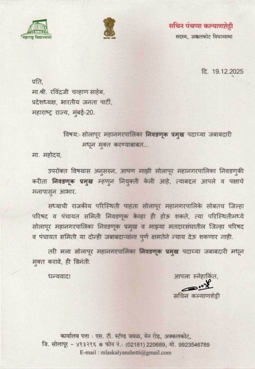 गत 5 नोव्हेंबर रोजी राज्यातील सर्व महापालिका आणि जिल्हा परिषद आणि नगर पालिकांसाठी प्रदेश कार्यालयाने निवडणूक़ प्रमुख आणि प्रभारी यांची नियुक्ती केली होती. त्याप्रमाणे राज्यभरात सर्व दायित्व पदाधिक़ार्यांनी कामकाज सुरू केेले होते. दरम्यान काल गुरुवारी प्रदेशाध्यक्ष चव्हाण यांनी आ.कल्याणशेट्टी यांची सोलापूर महापालिकेसाठी निवडणूक़ प्रमुख म्हणून नियुक्ती केल्याचे पत्र जारी केले होते. आ.कल्याणशेट्टी हे अक्कलकोट मतदारसंघाचे प्रतिनिधित्व करतात. शिवाय जिल्हा परिषद आणि पंचायत समितीच्या निवडणुकांची घोषणा होण्याची शक्यता आहे. त्या पृष्ठभूमीवर आ.कल्याणशेट्टी यांनी अध्यक्ष रवींद्र चव्हाण यांना पत्र पाठवून या जबाबदारीतून मुक्त करण्याची विनंती केली आहे.